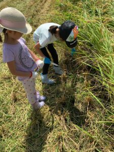 イベントは地元の農家さんの協力のもと進行。子どもたちは鎌の使い方を教わりながら、黄金色に実った稲を1株ずつ丁寧に刈り取っていきました。「こんなに重いんだ!」「これがご飯になるの?」といった驚きの声が飛び交い、自然の恵みを肌で感じる貴重な時間となりました。